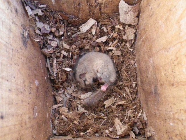 (巣箱の中のヤマネ。ふたを開けたときに少し動かしてしまったようです...ごめんね)
