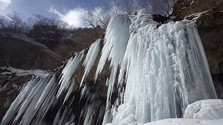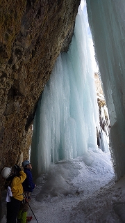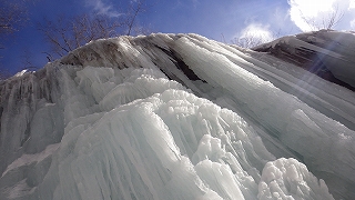 私たちは、ハーネスやザイルなどの装備があったので安全を確保しながら狭い巻道をトラバースし、奥を目指しました。すると、目の前に真っ直ぐ氷結した壮大な雲竜瀑が現れました。氷瀑でありながら、一部溶けていて水の音も聞こえていました。写真に納めきれない大きさで圧巻でした。