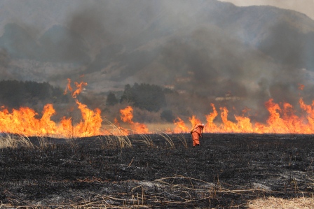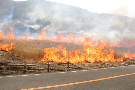 10時40分にススキ草原(18ヘクタール)の山麓側から着火。パチパチと音を立てながら徐々に燃え広がっていき、吹き下ろしの風が吹くたびに轟音を立てて火は大きくなっていきました。火が近くまで来ると音・熱・煙が凄く、大迫力でした。