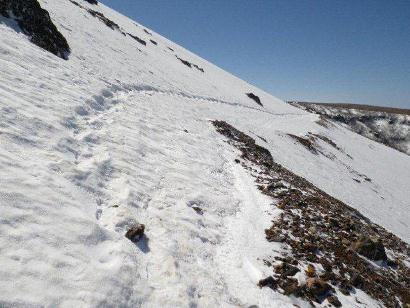 茶臼岳にはまだ雪が残る場所も多く、斜面をトラバースする場所、歩道が凍っている場所、地面がぬかるんでいる場所など滑りやすい場所がたくさんあります。