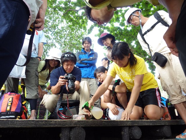 右)固有トンボの産卵用に設置したバケツの中を観察中