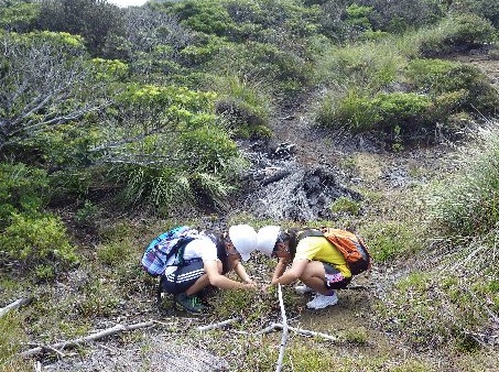 道中、グリーンアノール対策で設置している柵や捕獲用トラップ、ノヤギの駆除で個体数が回復傾向にある希少植物などを見ていただき、いよいよマイマイ探し。