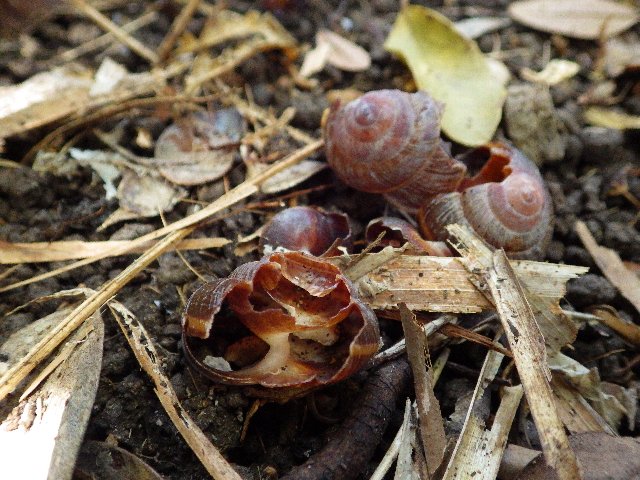 と素直には喜べません。実は兄島のマイマイもかなり厳しい状況にあるというのが現状です。兄島には外来種であるクマネズミが生息しており、ネズミによる食害で兄島のマイマイにも絶滅のおそれがあります。兄島で生息調査を行うとネズミ食害を受けたマイマイの死殻を見つけることは非常に簡単で、かつては兄島全島に生息していたマイマイも今では生息地・個体数ともに激減しています。