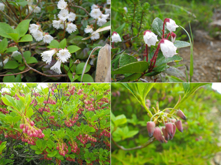 (左上から時計回りに白いイワカガミ、アカモノ、ウラジロヨウラク、ベニサラサドウダン)