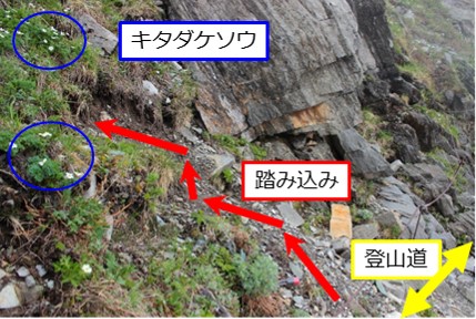 (赤矢印が踏み込み跡。登山道を外れ、キタダケソウの下まで続いています。)