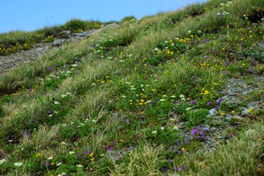 稜線ではチシマアマナ、ミネズオウ、イワウメ、オヤマノエンドウ、ミヤマシオガマなど多数の