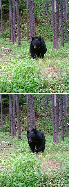 ちなみに、シカ侵入防止柵外のもの(小田代原周辺にて)ではありますが、赤外線カメラに映ったツキノワグマの連写写真を掲載します。このクマは移動中と見られ、優に体高60cmはある成獣です。このクマが通ろうとしているところは林道で、その林道を横切り、ほぼ正面に設置してあったカメラにより激写されたというものです。