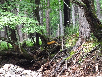 一部歩きやすい区間もありましたが、途中からは不明瞭になり、有志の者による目印はあるものの見落としもしやすく、わかりづらくなっています。そのため、地図と現地の地形を頼りに確認をしながら足を進めることが何より大切になります。歩道として整備されていない分、人の気配もあまりないので、道中、無邪気な動きをする黄テンに遭遇したり、ツキノワグマの糞を発見したりしました。