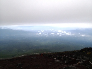 登山道を登っている最中も、その笠雲は富士山頂から少しずつ標高を下げ、元祖七合目に到着した時には、自分が笠雲の中に入っていました。