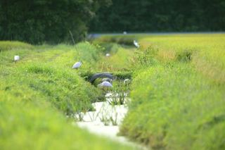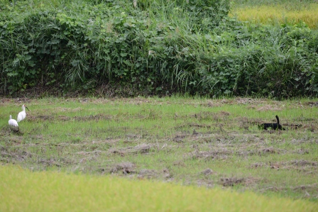 夏の間、大きく成長した稲の隙間に入ることが出来ず、トキたちは水路や農道、あぜなどで餌を採っていました。水路やあぜに降りたトキは、稲等に隠れてしまい、モニタリング業務中は識別どころか、トキを見つけることさえ困難でした。
