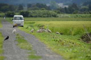 最近は、徐々に稲刈りが始まり刈田がぽつりぽつりと見られるようになりました。この時期になると、トキは好んで刈田を採餌場所として選びます。降下しやすく、周囲がよく見え、あぜや農道に比べて餌生物も豊富なのでしょう。まだまだ数少ない刈田を見つけ近付くと、10羽以上のトキの群れに遭遇することもあります。