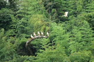 水路で探餌するトキ(2015/8/28撮影) 農道で休息するトキの群れ(2015/8/23撮影)