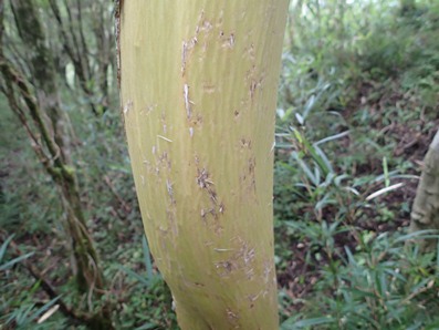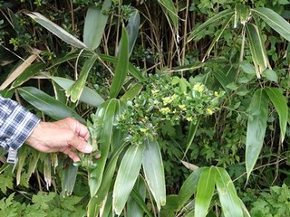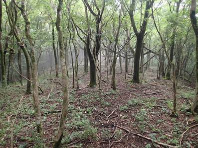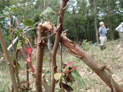 まずは南足柄の桧山林道を通って山に入りましたが、林道の法面の草が食べられて牧草地のようになっていました。よく観察してみると、ほとんど全ての植物に食痕があることがわかります。またヒヨドリソウのようなシカが好まない植物だけが残っています。