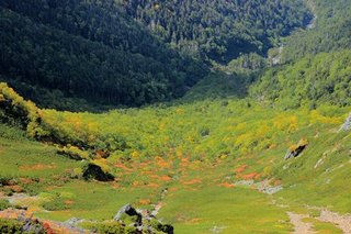 (塩見岳南東斜面の木々の色づき。9月20日撮影)