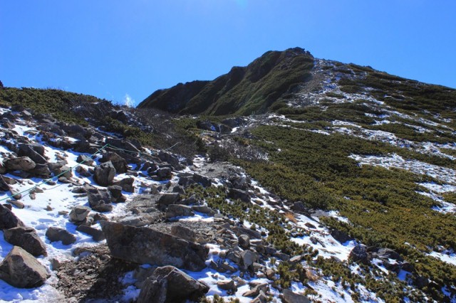 (小仙丈ヶ岳、仙丈ヶ岳、仙丈小屋の分岐から仙丈ヶ岳方面を望む。 10月14日)