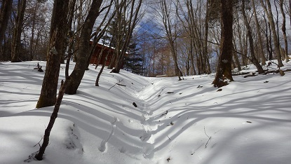 この日鷹ノ巣山頂の積雪は5から10センチ程度、積雪の多い北側斜面や吹き溜まりで30センチ未満でした。例年だと山頂で30センチは積もるそうなので、暖かさを目に見えて実感できました。
