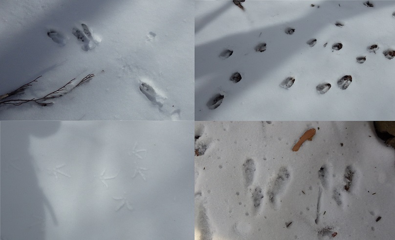 (動物の足跡 左上:イノシシ、左下:ヤマドリ、右上:ニホンジカ、右下:リス)