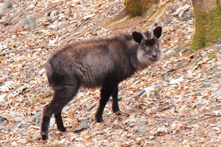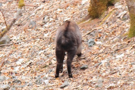 (こちらに気付き「なんだ?」と様子を窺うニホンカモシカ。)