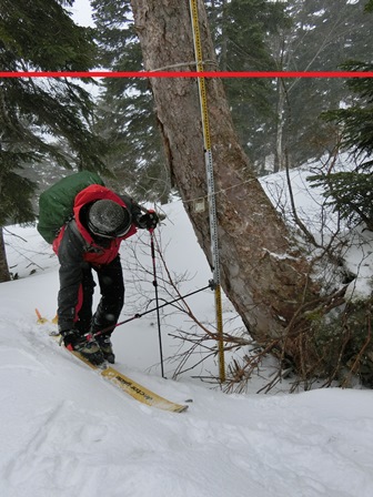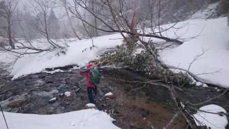 沢を渉る地点にはスノーブリッジはなく、滑走用具を脱いでの渡渉になります。