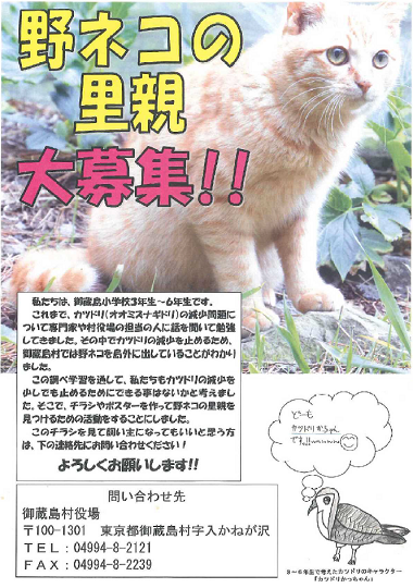 (ネコの里親募集ポスター 御蔵島村立御蔵島小学校3,4,5年生作成)