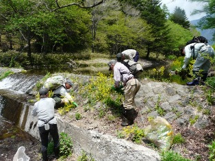 環境省では、戦場ヶ原の景観を守るため、日光パークボランティアの協力のもと、平成20年から戦場ヶ原上流部に流入する逆川を中心にハルザキヤマガラシの除去活動を継続して行っています。