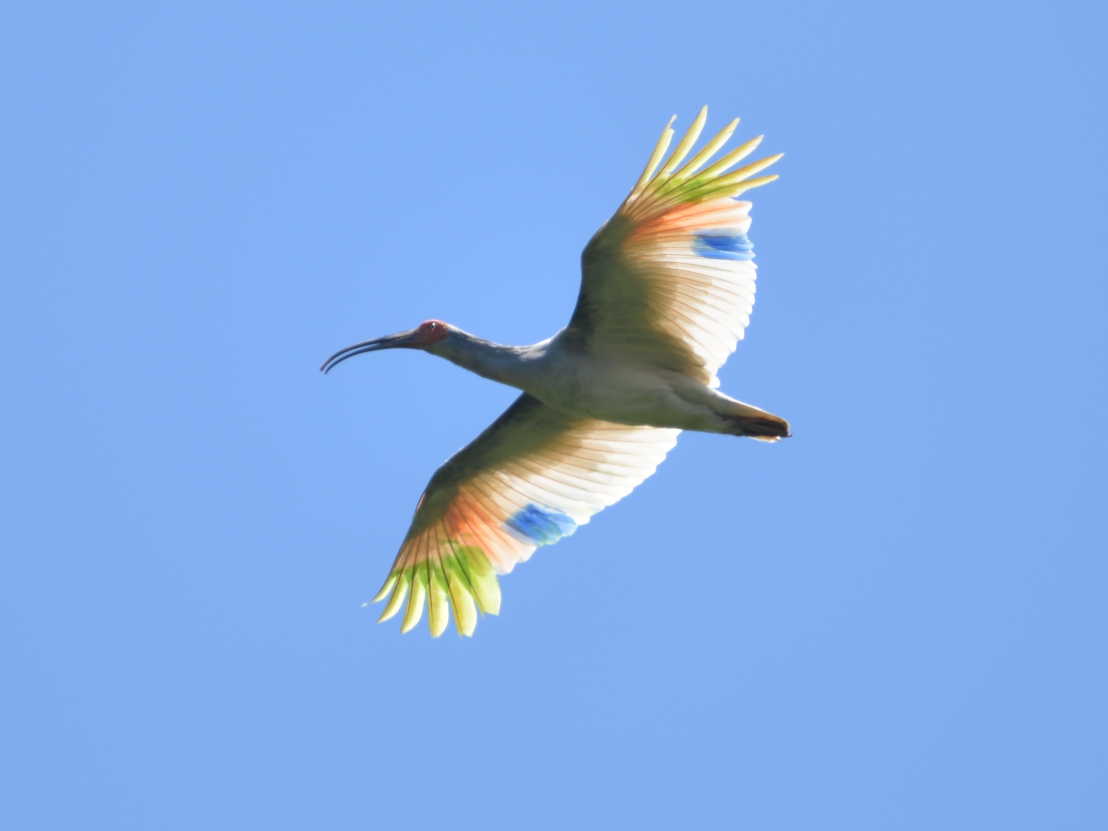 放鳥されるトキは、観察時に遠くからでも識別できるよう、特別にアニマルマーカー(動物専用の染料)を使用して着色されています。この着色された羽は、一年ほどで生え替わります。