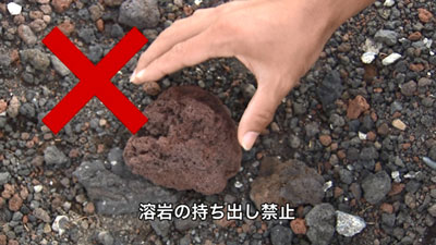 富士山に登った記念に溶岩を持って帰ろうという方は意外と多くいます。これも法律で規制されています。各個人が「石ころ一つ位ならいいだろう」という気持ちでも、毎年、何十万人の登山者が来る富士山ですので、みんながやると大変なことになってしまいます。また、石を並べて文字をつくったり、積み上げたりする行為もやめましょう。