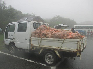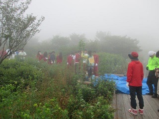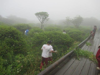 あいにくの霧雨でしたが、高校生たちは楽しそうにオオハンゴンソウを引き抜いていきます。土で汚れながらもたくましい根っこに苦戦する子、トゲトゲのアザミと格闘する子...それでも楽しそうな姿を見て、大人たちも負けていられません!