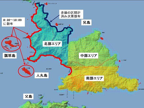 本日は滝之浦-吐出鼻-タマナビーチ-万作浜-家内見崎および家内見崎-ブラボーの海岸線、南部エリアのうち家内見崎の内陸部、北部エリア内陸部の散布を完了しました。