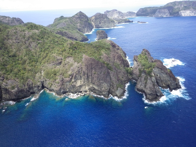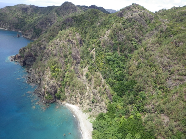 上空から見た滝之浦(写真中央部の黒い線はグリーンアノールの拡散防止柵)