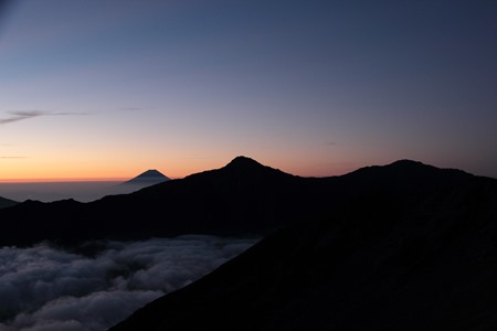(朝の日本の高峰トップ3。左から富士山、北岳、間ノ岳。9月2日撮影)