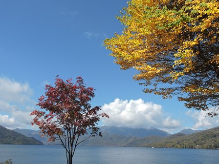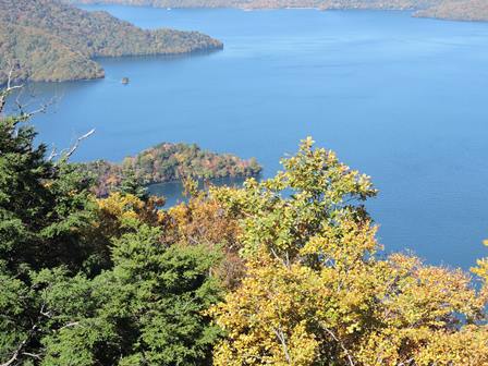 中禅寺湖道路の展望台からはこんな感じで見えます。これは10月20日なので、今はもっと鮮やかです。