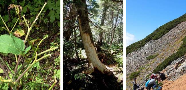 | 山に登ればシカの気配を頻繁に感じ、姿を見かけることもあります。 防鹿柵の外側では高山植物が食べられ、昔の写真に見られたお花畑は衰退し、植物が失われて土壌が流れ出てしまったような場所さえあります。 このワーキンググループで共有される情報が有効に活用されるよう、今後も関係者と協力し取り組み続けます。 |