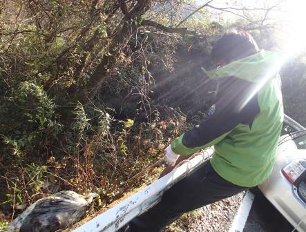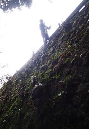 ちょうど道路脇が崖になっている所なので、ロープを使ってゴミを引き上げて行きます。