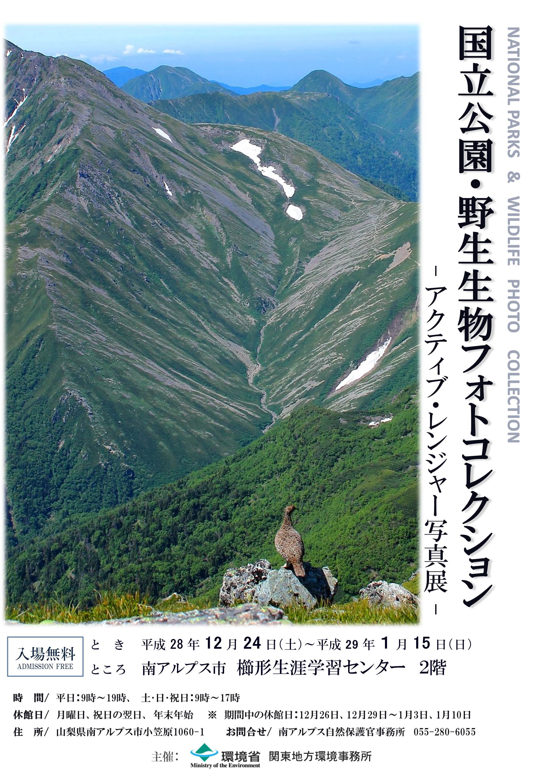 12月24日から南アルプス市櫛形生涯学習センターで、関東地区のアクティブ・レンジャーによる写真展「国立公園・野生生物フォトコレクション」が始まります!