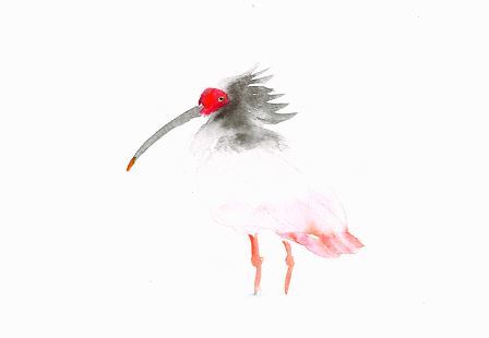 トキは繁殖期が近付く12月頃になると、首のあたりの黒い皮膚が厚くなり、粉状になってはがれ落ちます。これを水浴びをしてこすりつけることにより、頭から背中にかけて羽根の色を灰色に染めていきます。このように羽根の色を変えるのはトキだけだと言われています。
