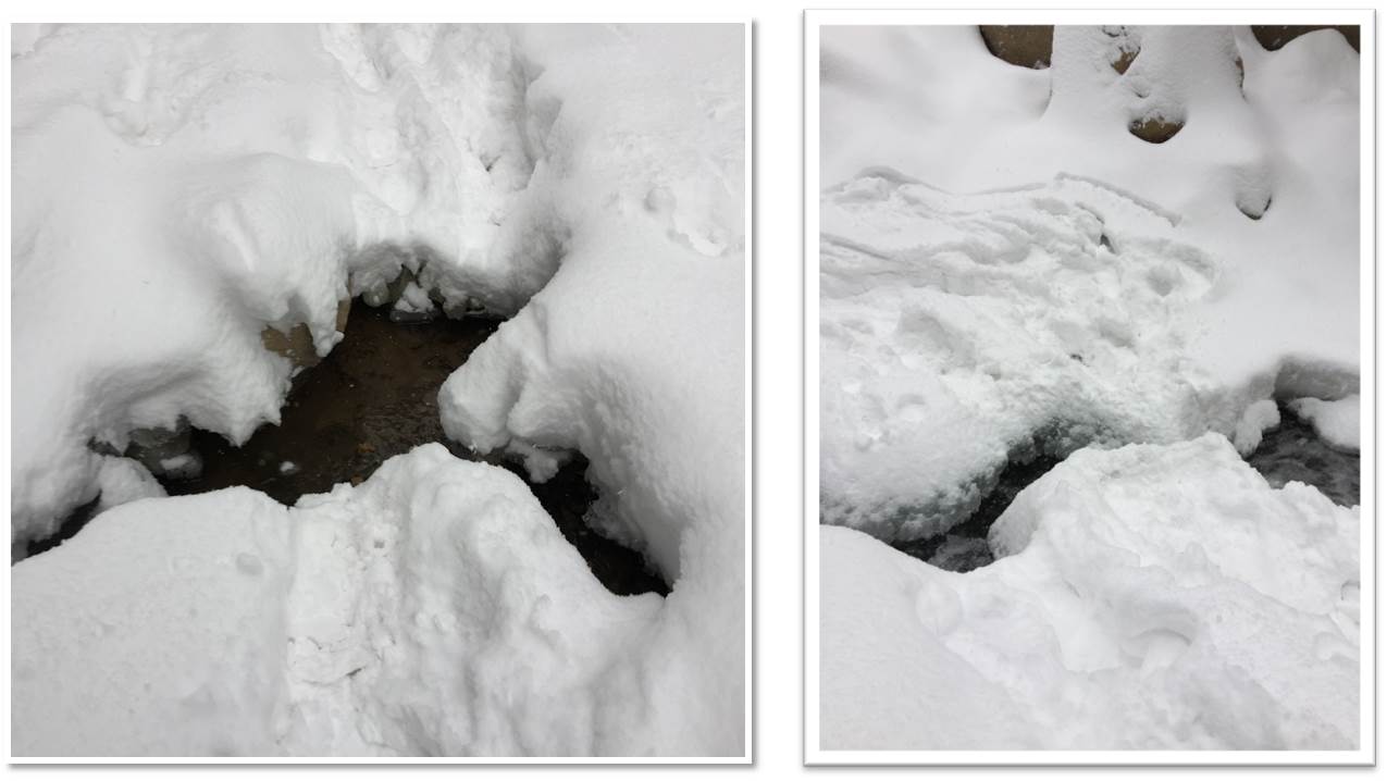 氷瀑にたどりつくまでには雪に埋もれた小川を渡りますので、足場をよく確認し、踏抜き等に注意することも必要です。