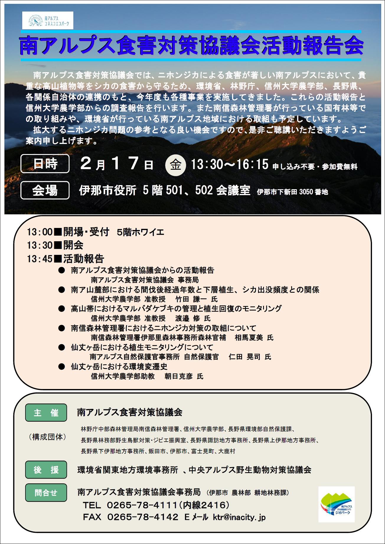 お知らせ:2月17日南アルプスのニホンジカ対策に関する活動報告会があります