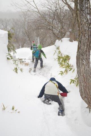 (1m以上の積雪の上を関係者で巡視中)