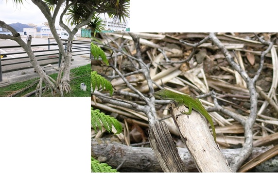 写真 アノールトラップ(左)と外来種のグリーンアノール(右)