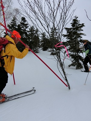 調査のルートを進みながら、山岳遭難救助隊の方が冬道の目印となるピンクテープをつけていきます。