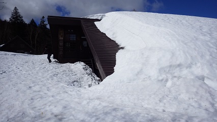 尾瀬沼に到着すると施設(ビジターセンター等)が雪に埋まっており、