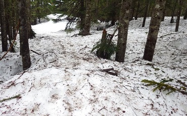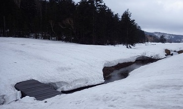 全く林道が見えない状況で、雪が溶けかけていることもあり、雪の中の空洞に足がはまりやすいです。