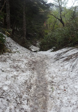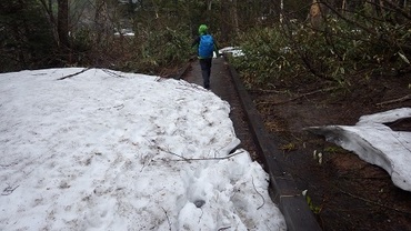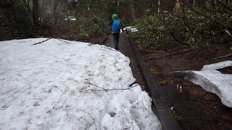 御池登山道から歩き始めは雪は木道にはあまりありませんが、登って行くにつれて雪が多くなります。
