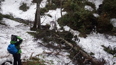 尾瀬沼から沼山峠の登山道は大江湿原は雪はありませんが、大江湿原を抜けてから沼山峠までは残雪しており、滑りやすくかつ踏み抜きもしやすいのでストックがあると便利です。