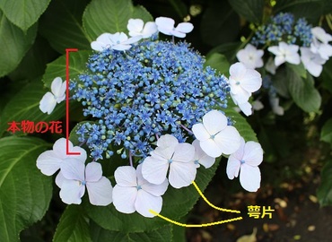 アジサイは土によってその彩りを変える、というのはちょっと有名な話ですが、ガクアジサイの萼片は特にその傾向が強いそうです。(根っこから吸収される養分が酸性⇒青系、中性~弱アルカリ性⇒赤系)