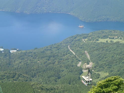 動き出すとあっという間に高度を上げていくロープウェー。先ほどまで間近にあった芦ノ湖もぐんぐん小さくなります。
