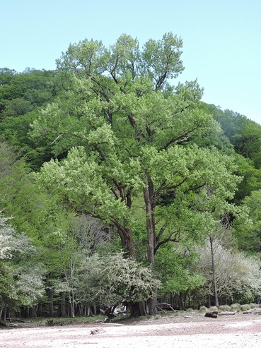 戦場ヶ原の赤沼発の低公害バスに乗って、西ノ湖入り口で下車し約20分ほど歩くと柳沢川を渡る吊り橋があります。橋を渡ると巨木の森になります。この当たりは千手が原と呼ばれ、ハルニレやミズナラの巨木が林立しています。森を抜けると西ノ湖です。ここではヤチダモ林が有名ですが、湖岸には巨木も多いです。