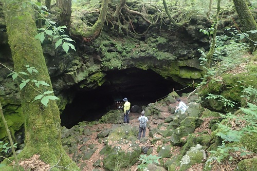 青木ヶ原樹海の中を散策し、途中、富士山の火山活動にできた溶岩洞穴「竜宮洞穴」