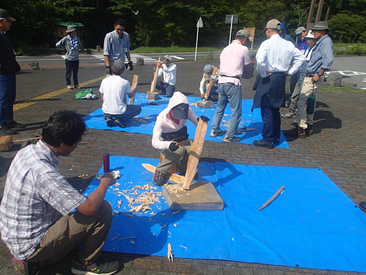 丸太から登山道補修に使用する杭を作っていきます。研修では土に差し込みやすいように先を尖らせる作業を行います。